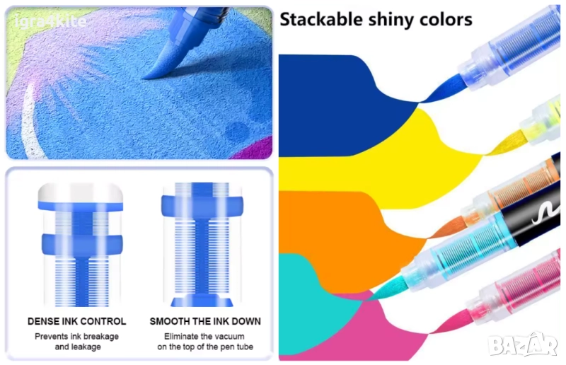 -Четка с мек, еластичен връх, вграден резервоар напоен с висококачествено мастило в богата гама цветове.