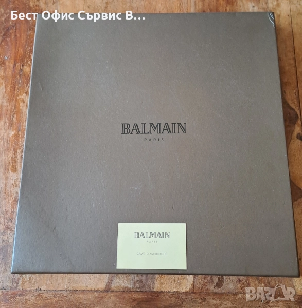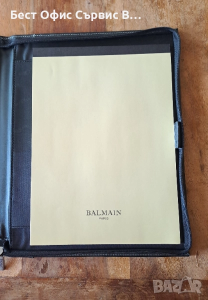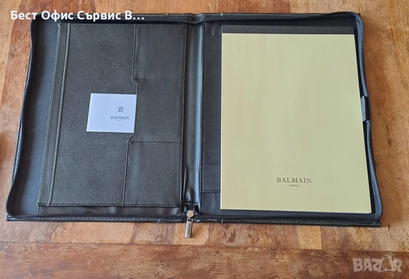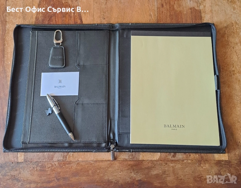 Продавам химикалка, органайзер и ключодържател кожени Балмейн Париж Balmain Paris комплект. Произведен във Франция. Органайзерът за документи с размери : 26,5x34x2,5 см. Органайзерът е с цип и 4 джоба за визитки, папки и документи. Има тефтер с 20 листа с размер 21x29,5 см. Химикалката е метална и от естествена кожа. Има пълнител тип "Parker". Ключодържателят е с размери 10,5x4,5 см. Комплектът има и сертификат. В оригиналната кутия с размери 35x37x3,6 см. Уникален комплект. От частна колекция. Страхотен подарък. За ценители.