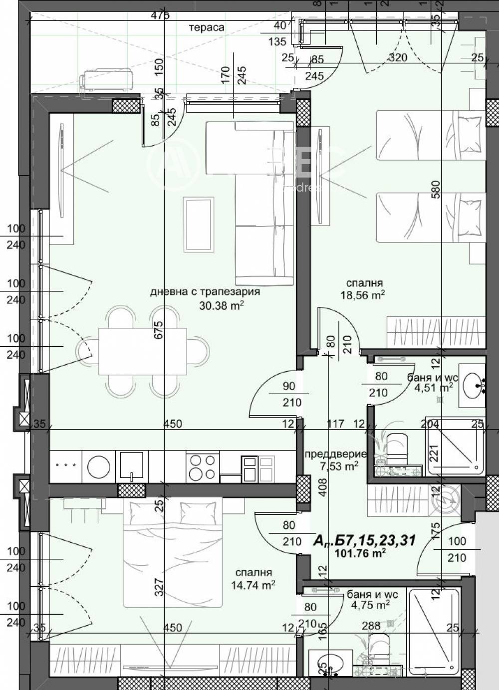 Тристаен апартамент, състоящ се от: дневна с трапезария, две спални, две бани с тоалетни, склад и тераса. Подобни апартаменти се предлагат на различни етажи.