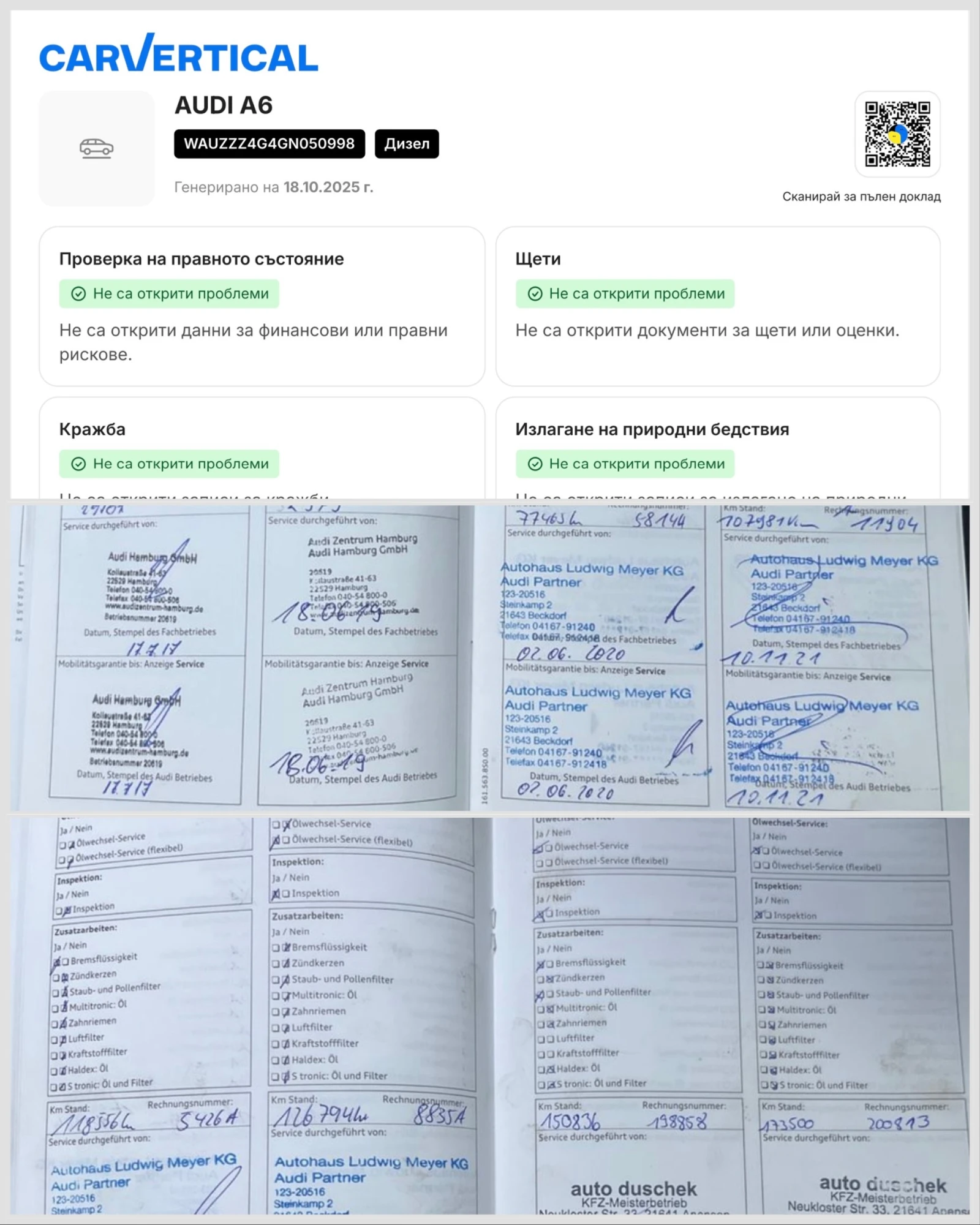 AUDI A6 3. 0 V6 TDI clean diesel quattro COMPETITION Tiptronic S line - 🚗 Представяме Ви проверен, употребяван автомобил с доказан произход, 📍 наличен в гр. Русе. - 📌 Audi A6 3. 0 V6 TDI clean diesel quattro Competition 325 к. с. Tiptronic S line, съвършена комбинация от спортен дух, динамика и ненадминат комфорт създадена да подчертае стил и класа. - 🇩🇪 Закупен от представителство на Audi в Германия. - 💯 Пълна сервизна история, подкрепена с документи и гаранция за реалния пробег и произход. Автомобилът е преминал двустепенна проверка за автентичност сигурност и прозрачност за всеки клиент! - 💯 Последно обслужване: 01. 02. 2025 г. при 173 500 км - ‼️ След пристигането автомобилът е преминал цялостна диагностика и тестово шофиране (30 50 км), за да сме сигурни, че всички системи и агрегати функционират безупречно. - 🔧 Възможност за оглед, тестово шофиране и проверка в официален сервиз на Audi или друг по Ваш избор. - 📜 Сити Карс има договорни отношения с: Уникредит Лизинг, Алианц Лизинг, ОТП Лизинг, ДСК Лизинг, Порше Лизинг и TBI, което позволява да предложим преференциални финансови решения с бързо одобрение, включително и без доказване на доход. - 📹 При желание и с предварителна уговорка предлагаме онлайн видео оглед на автомобила удобно и безплатно. - 🚚 Осигуряваме доставка на автомобила до всяка точка в страната сигурно и коректно. - 🧾 Продажба с данъчна фактура и договор без нотариални такси. - ☎️ Ако нещо не Ви е ясно обадете се. Обясняваме всичко подробно. 🔹 ТЕХНИЧЕСКИ ДАННИ - Година на производство: 2015 - Първа регистрация: 08. 2015 г. - Мощност: 240 kW / 325 к. с. - Двигател: 3. 0 V6 TDI clean diesel - Скоростна кутия: Автоматична Tiptronic (8 степени) - Задвижване: Постоянно 4x4 quattro - Евро стандарт: Euro 6 - Пробег: 181 550 км - Цвят: Daytonagrau Perleffekt (сив металик, оригинален) - Интериор: Кожен салон Valcona с релефно лого S line (оригинален) - Каросерия: Комби - Места: 5 - Брой собственици: 2 - Брой ключове: 2 - VIN: WAUZZZ4G4GN050998 🔹 ОБОРУДВАНЕ И ЕКСТРИ - Адаптивно въздушно окачване (adaptive air suspension) регулира височината и твърдостта на автомобила според пътя и режима на шофиране, осигурявайки максимален комфорт или стабилност. - Matrix LED фарове с асистент за дълги и динамични (бягащи) мигачи отлична видимост и модерен дизайн. - Head-Up дисплей проектира важната информация върху предното стъкло, за да не отклонявате поглед от пътя. - Bose Surround Sound премиум аудио система с дълбок звук и перфектна акустика. - Soft Close (вакуумно затваряне на вратите) луксозна и удобна функция за тихо и прецизно затваряне. - Panoramic roof стъклен панорамен покрив, електрически отваряем в предната част. - S line спортен пакет интериор и екстериор агресивна визия, спортни седалки и алуминиеви акценти. - S line спортно окачване по-ниско и прецизно, за по-директно управление и стабилност. - Audi Drive Select избор на режими на шофиране (комфортен, динамичен, индивидуален). - Adaptive Cruise Control (автоматично поддържане на дистанция) регулира скоростта спрямо автомобила отпред и спира/потегля автоматично. - Lane Assist активен асистент за задържане в лентата. - Side Assist предупреждава при автомобили в мъртвата зона. - Traffic Sign Recognition разпознава пътните знаци и ги показва на дисплея. - Park Assist + 360 Top View камери автоматично паркиране и пълен обзор около автомобила. - Audi pre sense basic и rear подготвя автомобила при риск от удар. - Допълнително отопление (печка / Webasto) предварително затопля купето и двигателя. - 4-зонова климатична система индивидуален климат контрол за всички пъ