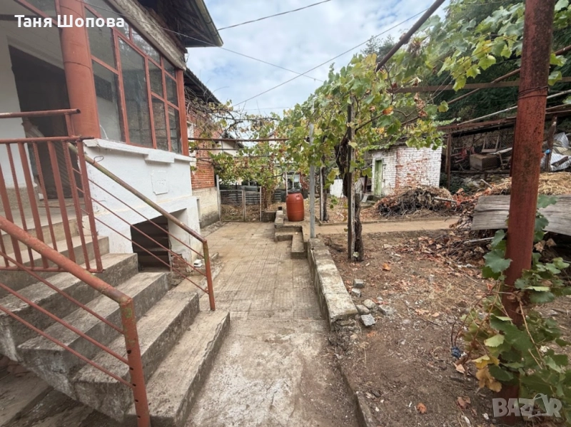 Агенция за недвижими ИМОТИ ШОПОВА предлага на Вашето внимание за продажба двуетажна къща в предпочитан район за живеене в град Петрич. Поземлен имот е с площ 865 кв.м., построени в имота са две жилищни сгради. Едноетажна жилищна сграда със застроена площ 63 кв.м., с основи каменна зидария, конструкция гредоред, нуждаеща се от основен ремонт. Двуетажна жилищна сграда със разгъната застроена площ 100 кв.м., основите са изградени от каменна зидария. Конструкция на сградата е гредоред, / спалнята на втори етаж е с бетона плоча/ , дограма – бяла ПВЦ, стени – варова мазилка . Първи етаж се състои от кухня , коридор и спалня. Втория етаж се състои от входен коридор, кухня със всекидневна, спалня, баня с тоалетна. До основната къщата е изградена едноетажна къща, която може да се преустрои на лятна кухня с мазе или за живеене. Ако търсите самостоятелна къща в тих и спокоен район за живеене, този имот е за Вас ! Намиращ се в близост до Стадиона в град Петрич.