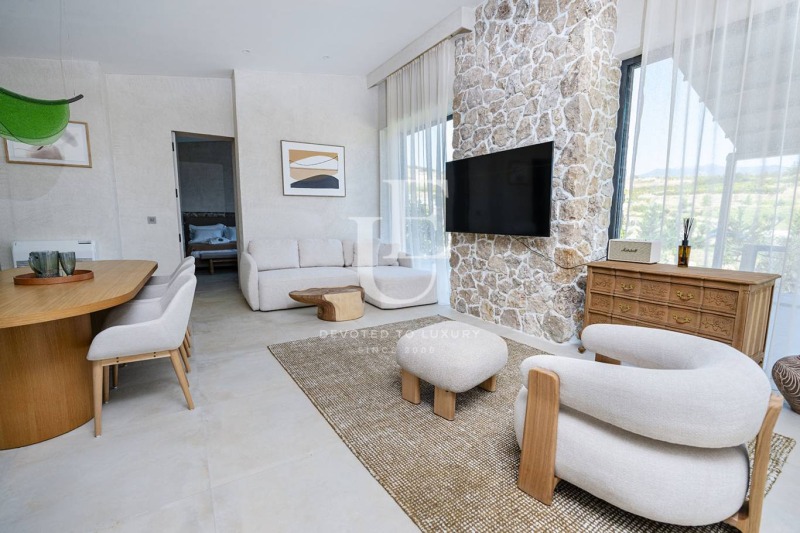са с площ от150кв.м. Жилищна площ 100 кв.м и тераса 50 кв.м. Спалня, хол, два санитарни възела. Тавани с височина от З до 4,40 м. Минерален басейн (15 кв.м) към всяка тераса, барбекю зона, две засенчени паркоместа, ландшафтно оформление на терасите с подбрани декоративни видове, бутиково екстериорно осветление: Vibia, Cattelani&Smith, Mogg, Led 2, самостоятелна енергийна система.