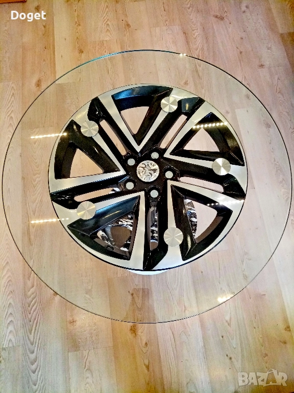 Стъклена маса с уникален дизайн. Масата има кръгъл стъклен плот, поставен върху основа, изработена от автомобилна джанта. Това придава модерен и уникален вид на мебелта. Подходяща за дома, офиса, кафене или студио, тази маса ще добави стил и характер към всяко пространство. Размери - височина 70см. и диаметър 80 см Цена 1100лв. За поръчки на лични съобщения.