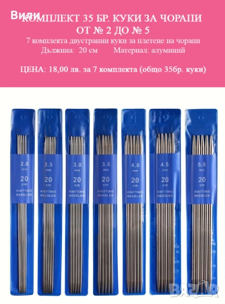 Предлагам комплект от 35 бр. игли за чорапени от № 2 до № 5 - общо 7 комплекта двустранни куки за плетене на чорапи.
