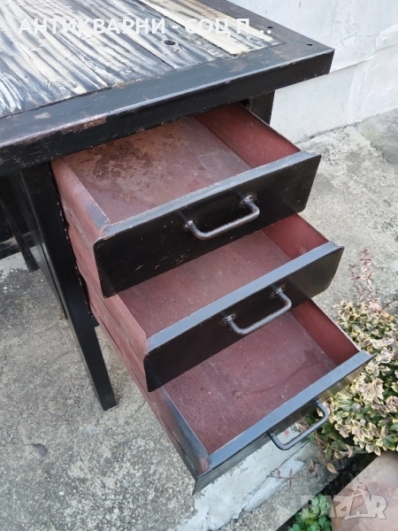 - Масата е в перфектно състояние за годините си, напълно здрава и изключително масивна, тегло 80кг. масата разполага и със 3 метални чекмеджета за инструменти, напълно надеждна за ежедневна употреба, подходяща за употреба в работилница, гараж и много други, нищо общо с днешните китайски боклуци на пазара, всичко е снимано подробно, размерите са на снимките!