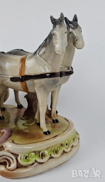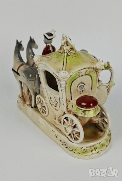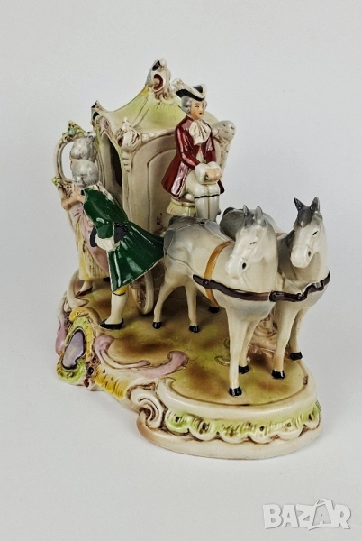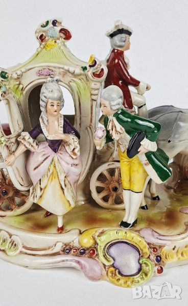 Порцеланова композиция, изобразяваща сцена от XVIII век - елегантна дама, придружена от кавалер, пред разкошна каляска, теглена от два коня. Украсена с детайлни барокови орнаменти, ръчно оцветена в пастелни тонове и позлатени акценти.