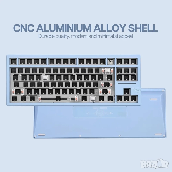 · Това е BAREBONE комплект (база за механична клавиатура). Това означава, че комплектът НЕ ВКЛЮЧВА механични ключове (switches) и keycaps (печатните копчета). Трябва да ги закупите отделно, за да сглобите и използвате клавиатурата!