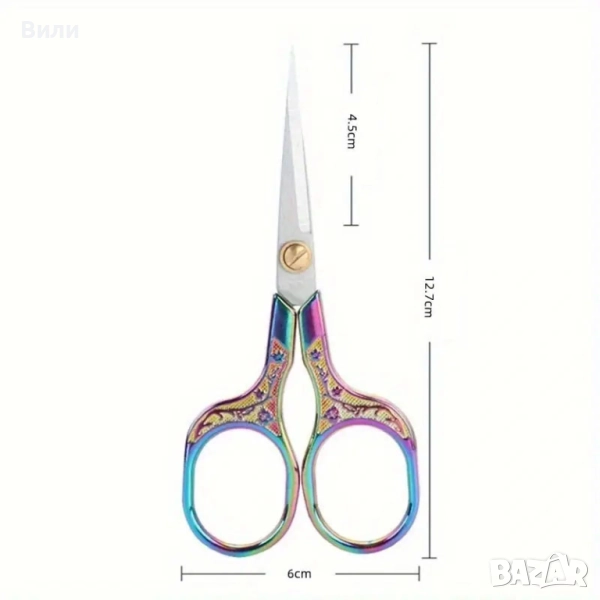 Предлагам винтидж ножичка от неръждаема стомана в шарен цвят, подходяща за тъкани, конци, бродиране и шиене.
