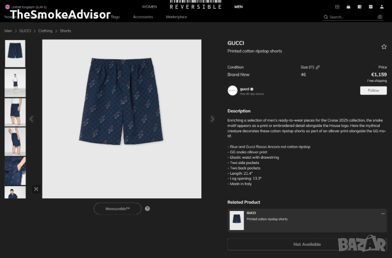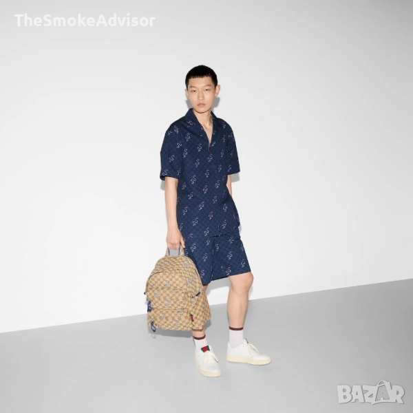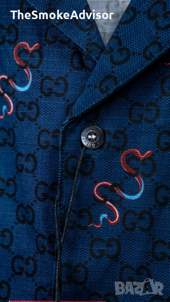 Луксозният GG snake принт съчетава класическото лого с енергията на митичната змия – символ на прераждане и мъдрост. Материята е устойчива, лека и приятна на допир, създадена за комфорт и елегантност в движение. Отворената яка, свободният силует и фините странични цепки подчертават усещането за премиум италиански стил, който не следва тенденциите, а ги задава.