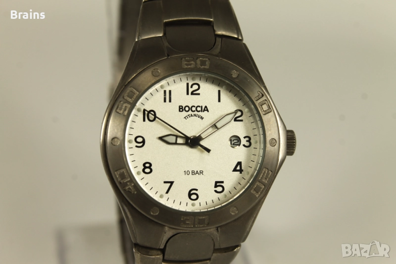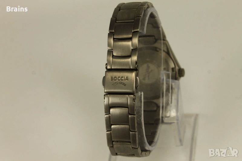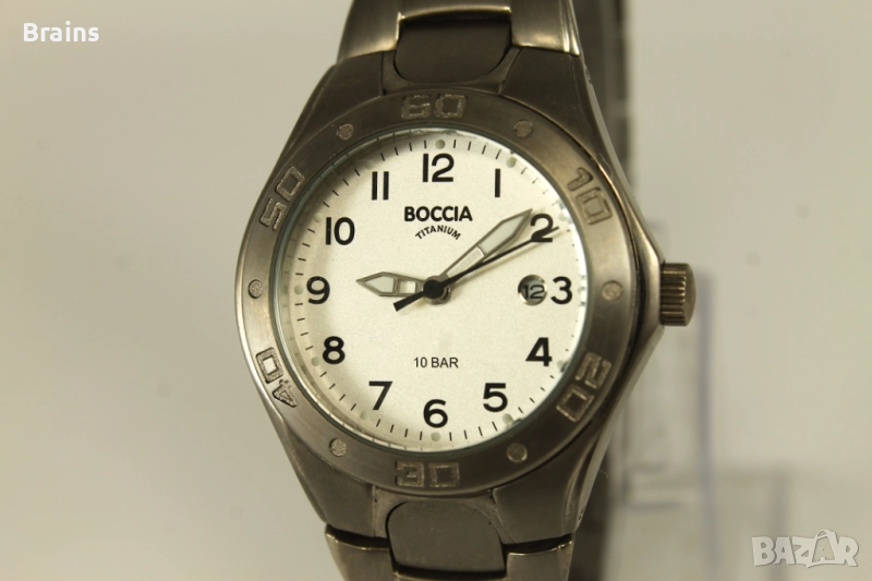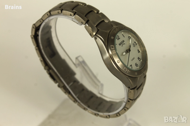 Дамски ръчен часовник BOCCIA Titanium. Изцяло изработен от титан - каса, задна капачка и веригата. Часовника е супер лек и удобен. Кварцов механизъм, работи точно, календара работи. В отлично визуално състояние.