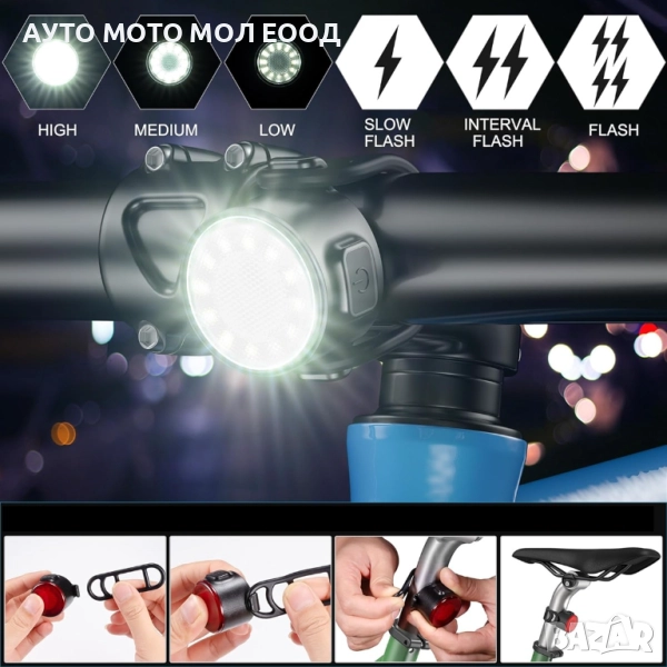 Комплект водоустойчиви LED светлини за велосипед с 2 режима на светене.