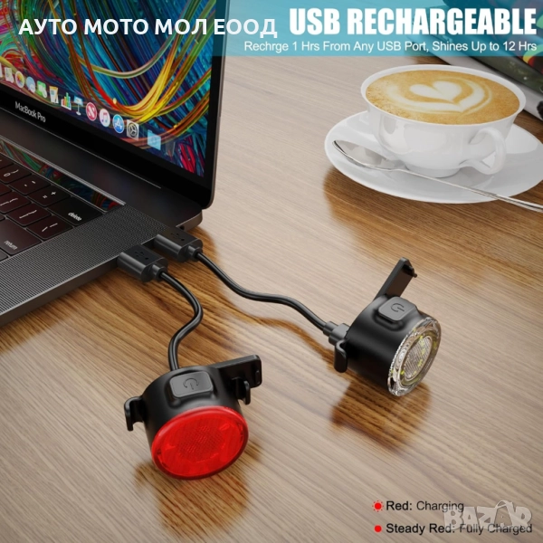 Комплект LED Фар и Стоп за велосипед с USB зареждане.