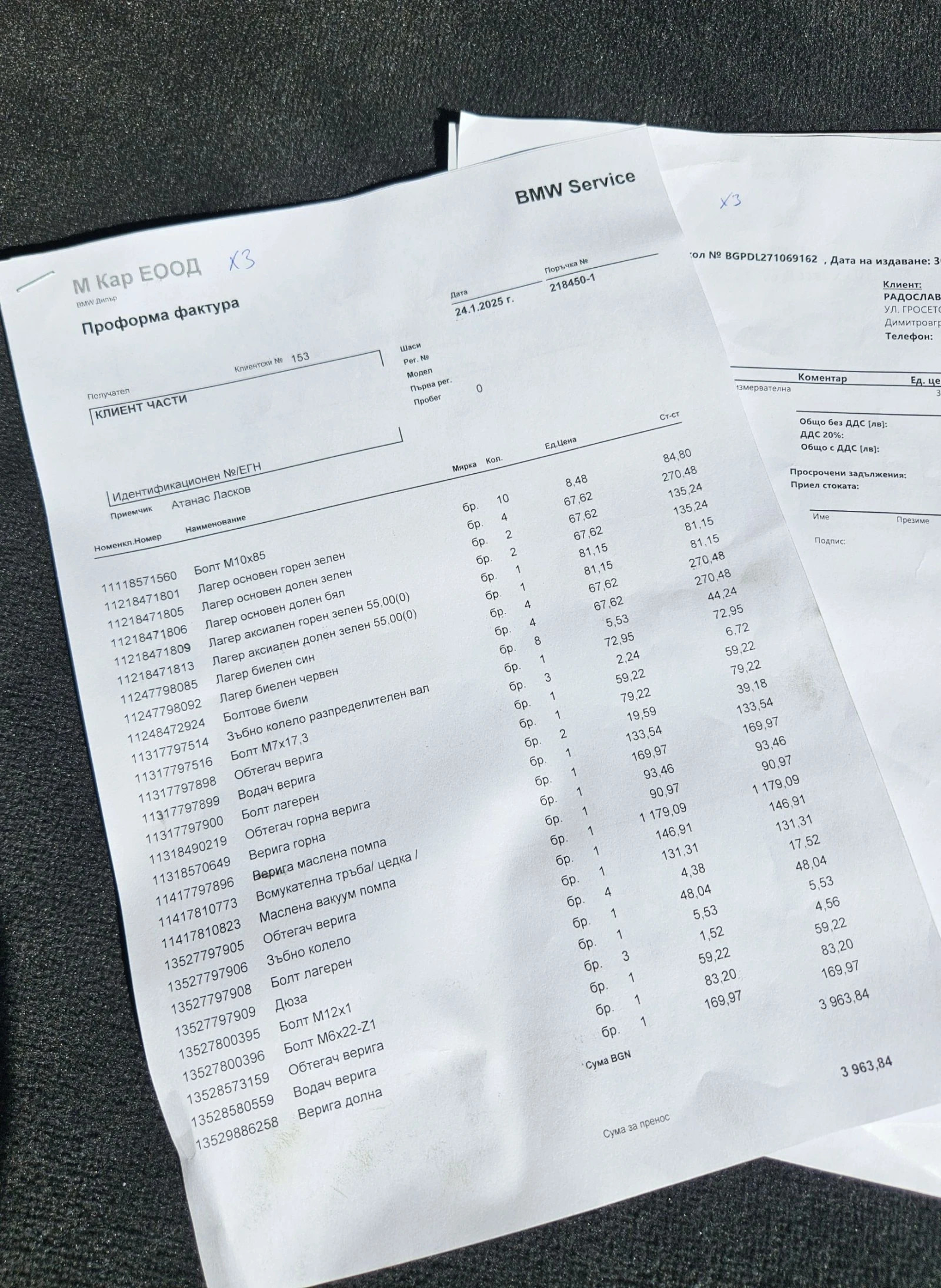 Здравейте, продавам BMW X3 F25 2014 г. / 2. 0 D Х-drive / 184к. с, произведен през 2014 г. , с РЕАЛЕН пробег от 210000 км. Сменени масло на двигател и филтри преди 100км Автомобила е съхраняван само и единствено в гараж. VIN : WBAWY310800F30218 Сменени са следните неща : Вериги, основни и биелни лагери, маслена помпа, както и вихровите клапи. Сменени са всички масла скоростната кутия, раздатката, предния и задния диференциал. Автомобила е с всесезонни гуми, закупени преди 6000 км, като тогава са сменени дискове, накладки и датчици. Навигационната система е с актуализиран софтуер. Системата Start-Stop е с памет, което означава, че запаметява последната настройка и не се налага да я изключвате при всяко палене. Налични са два оригинални ключа. Електрически теглич. Х-3то е в безупречно техническо и визуално състояние. Възможен е оглед в доверен от Вас сервиз, както и проверка за реални километри.