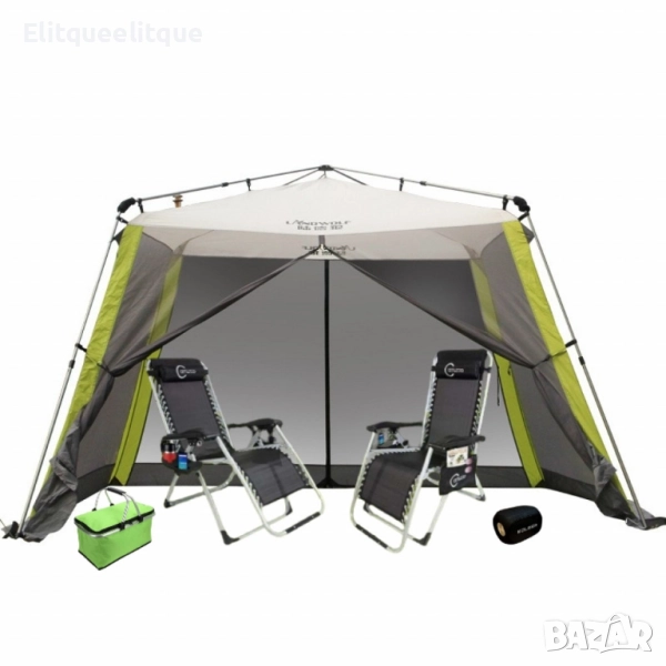 Общи компоненти (за двата варианта) Сгъваеми шезлонг столове: (Продава се без масичката изобразена на снимката.) - 19832 Дължина при сгъване: ~ 170 см; Височина на седалка: ~40 см | Гръб: 75 см Ширина: 67 см | Височина на цял стол: 93 см; Включени: маса (80 см), табла (17x28.5x4 см), органайзер (32x20 см), възглавница (35x12x6 см); Сгъваеми размери: 67x93x18 см | Тегло: 8 кг. Сгъваема хладилна чанта/кошница: 15413 - TV728 Материали: полиестер, алуминиева рамка, подсилено дъно; Характеристики: лека, здрава, с отлична изолация; Предназначение: плаж, пикник, къмпинг, пътуване; Сгъваема за лесно съхранение. Bluetooth колонка KOLEER S918: - 17301 Звук: мощен бас, ясни високи тонове; Батерия: до 10 ч. възпроизвеждане (литиево-йонна); Свързаност: Bluetooth, AUX, microSD; Допълнително: вграден микрофон, водоустойчив корпус; Цвят: според наличността; Гаранция: 12 месеца. Вариант 1: Плажен комплект с чадър: 2x Плажен чадър;- 19951 - 2бр Диаметър: Ø2.40 м; Височина: 2.70 м; Материал: UV-устойчив полиестер; Цвят: Син; Конструкция: Метална стойка. Вариант 2: Къмпинг комплект с шатра 1x Палатка тип шатра; - PALAT6 Вместимост: подходяща за 5-8 човека; Тип: шатра/навес, идеална за къмпинг или събирания на открито; Осигурява защита от слънце и лека влага; Сглобяема конструкция за бърз монтаж и демонтаж.