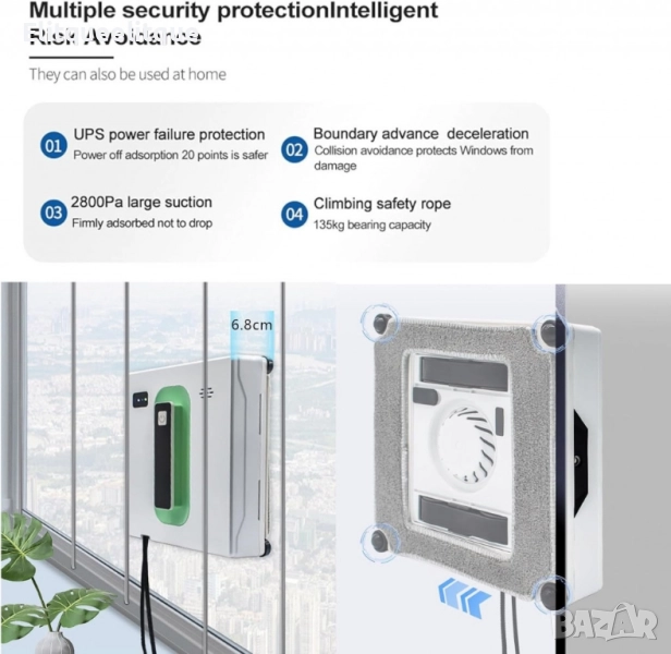 Робот за почистване на прозорци Voltz, 72W, всумак. мощност-2500Ра, Wi-Fi, 2 дюзи, контейнер 40мл
