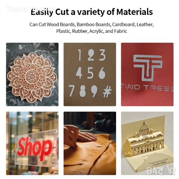 Обработваеми материали: дърво, кожа, крафт хартия, бирен картон, бамбук, пластмаса, плексиглас, неръждаема стомана, черен гранит.