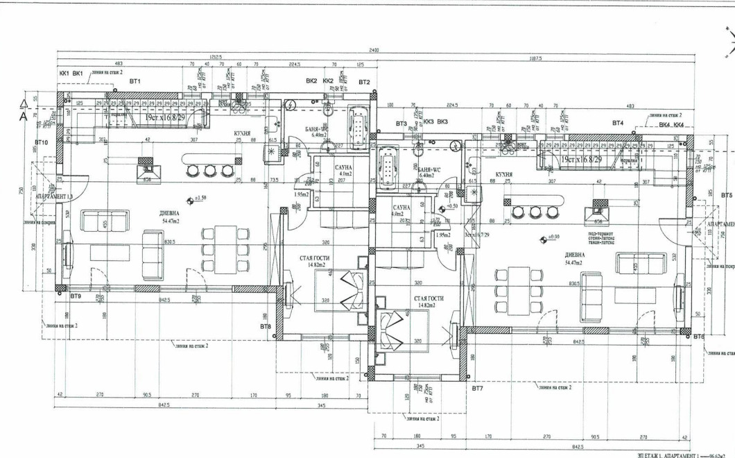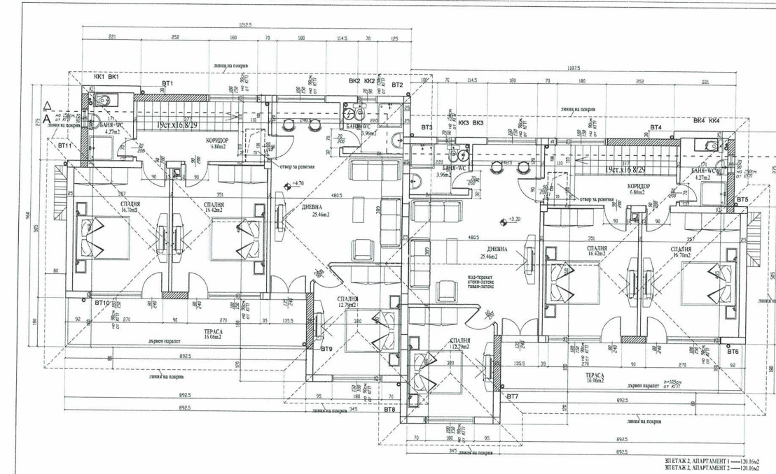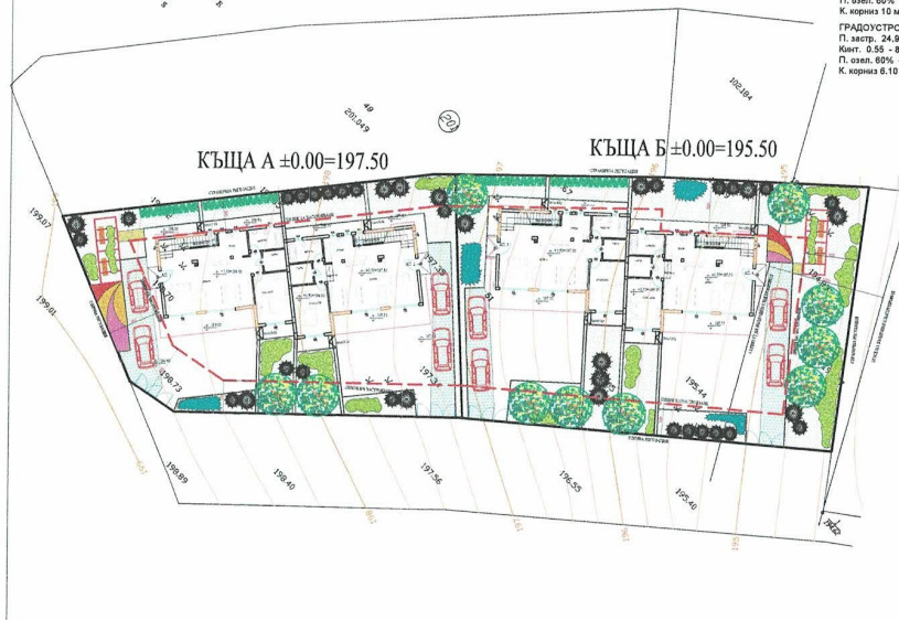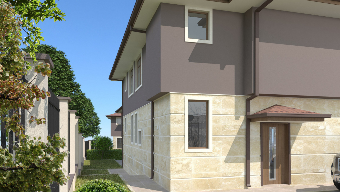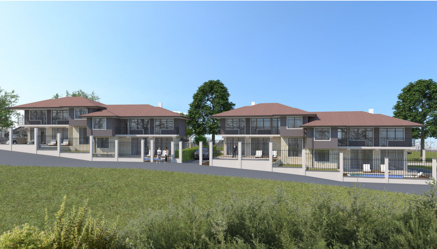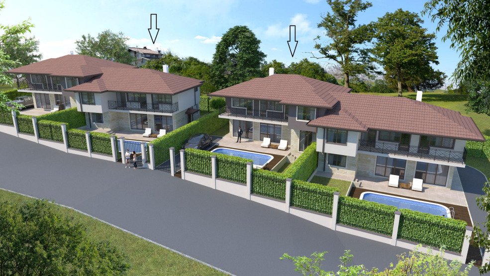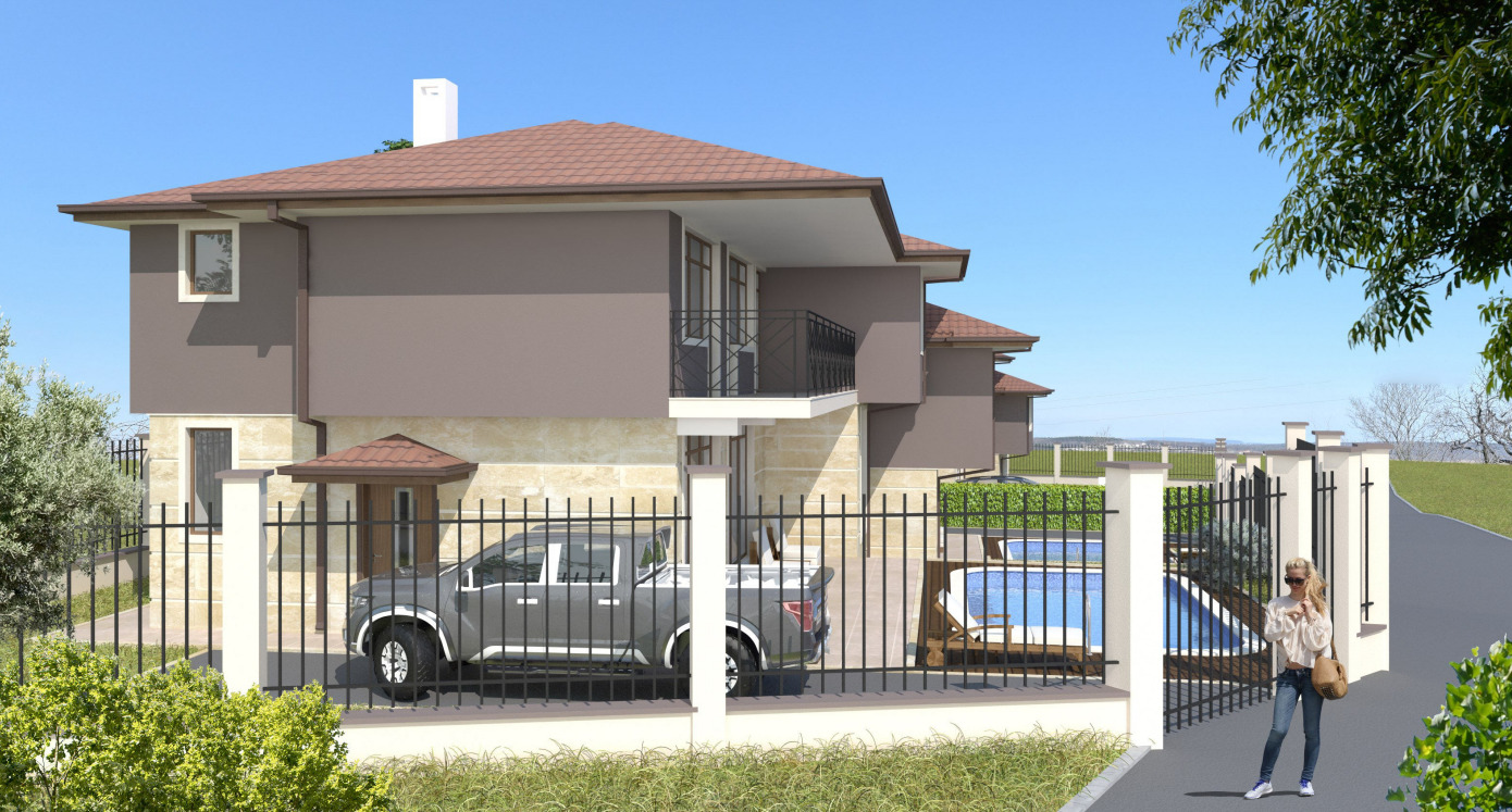 Състояние: В двора има басейн 4м х 8м и възможност за паркиране на 3 автомобила. Двете къщи са монолитни, със стоманобетонна плоча над първия и втория етаж. Покривите са четирискатни, с дървена покривна конструкция, дървена обшивка на стрехите и покривите с керемиди. На терасата е предвиден парапет от стъкло и алуминий. Външната мазилка е минерална, дограмата е PVC и топлоизолацията е 10 см. Към всеки от имотите има самостоятелен басейн. Грубият строеж на къщите се очаква да се завърши до 31.05.2024 г. Цялостното завършване по БДС се очаква да бъде до 31.12.2024 г.
