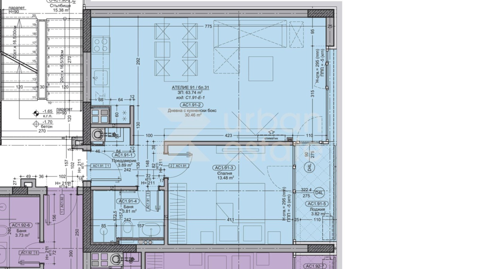 -Спалня (13.50кв.м.) с тераса към нея (3.80кв.м.) -Дневна с кухненски бокс (30.50кв.м.)