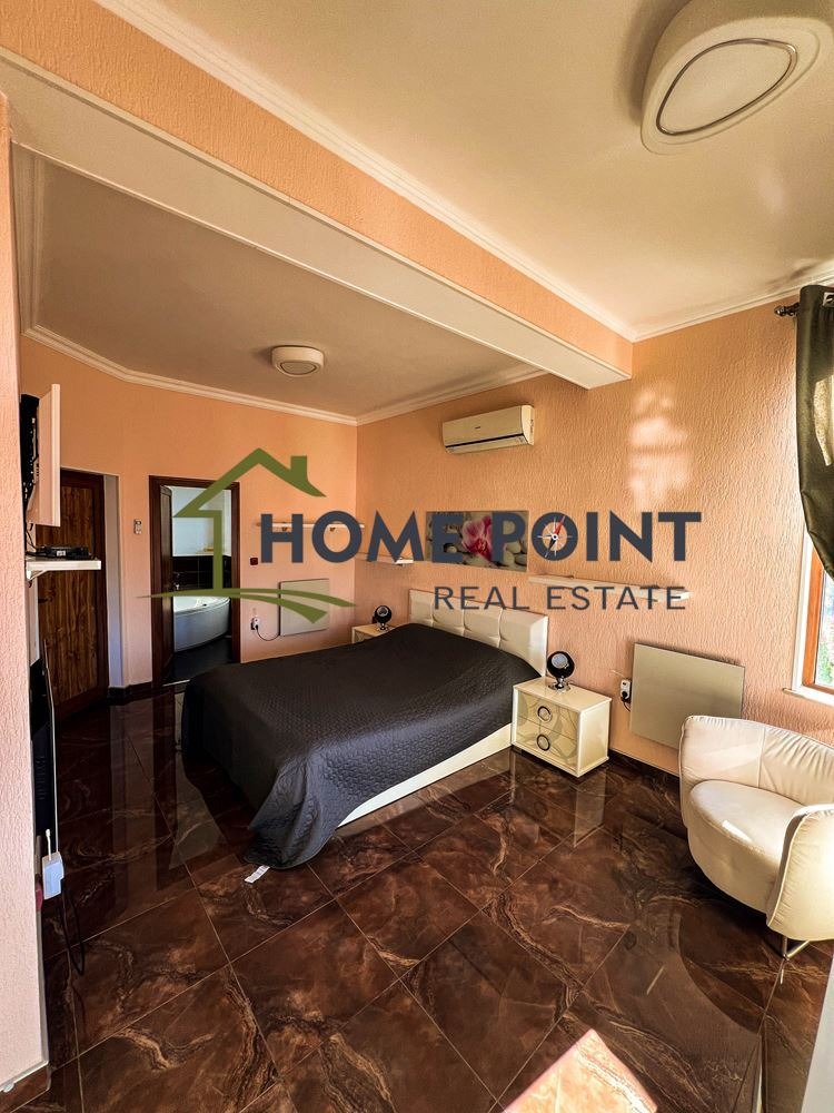 Състояние: Къщата е изградена с качествени материали, всички стаи са обзаведени с качествени и стилни мебели. Кухнята е оборудвана с всичко необходимо за едно домакинство. Спалните и баните са обзаведени и оборудвани с вкус. Отоплението е организирано с автоматична система за подово отопление и допълнително 30 бр. LED инфрачервени панели, както и камина във всекидневната, а охлаждането е посредством висок клас климатици Panasonic. Къщата е готова за нанасяне. Налични две паркоместа за собствениците на имота.
