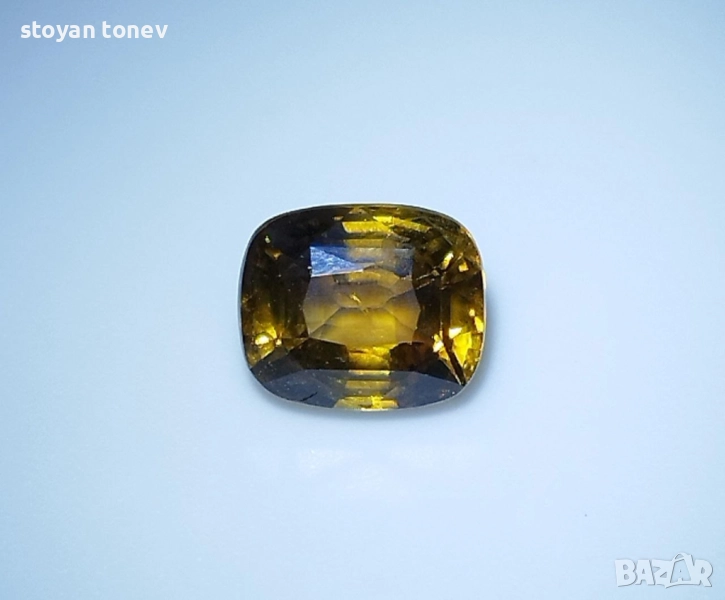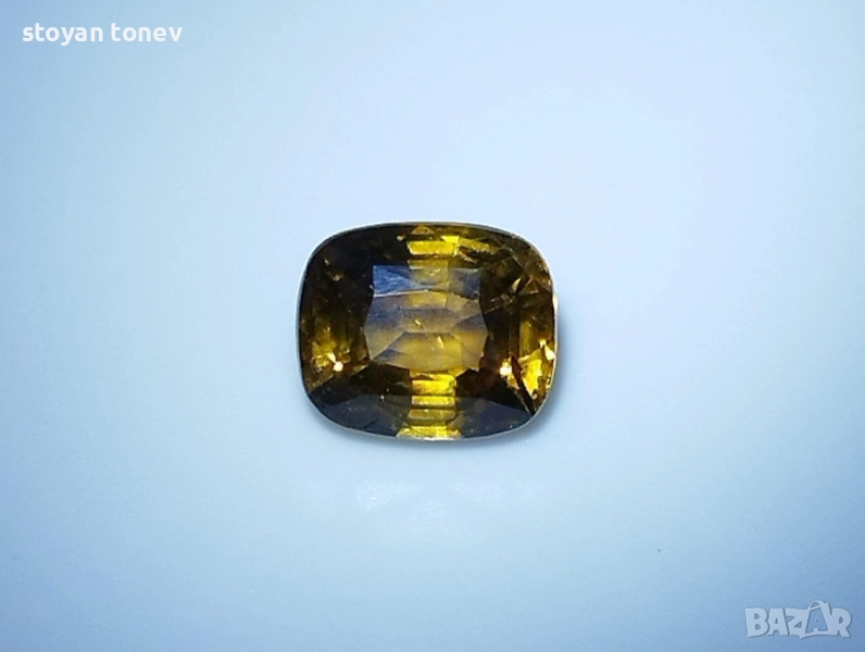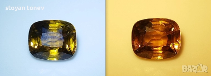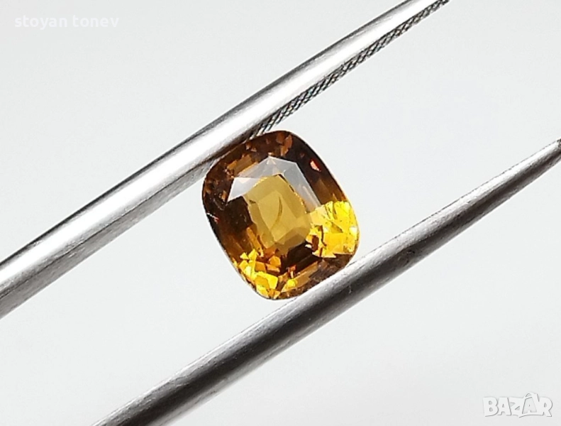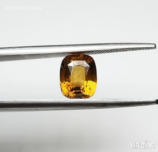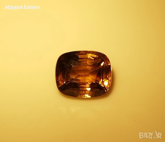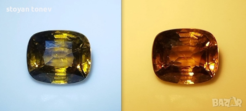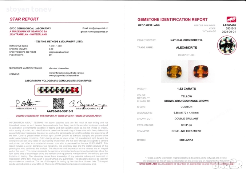 Естествен александрит с тегло 1.52кт. и произход Шри Ланка. Чистота VS1 с минимално видими включения. Цвета е жълто кафяво-оранжев при дневна светлина и оранжево-кафяв при жълто изкуствено осветление. Къшън кът с размери: 6.88 x 5.72 x 4.18 mm.