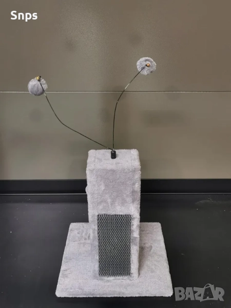 Съчетава се добре с всеки интериор на стаята, благодарение на неутралния си цвят. Драскалката за котки е снабдена с гумена четка за приятен масаж, както и с подложка за драскане от юта. Има и две малки топчета с прикрепена камбанка за допълнително забавление.