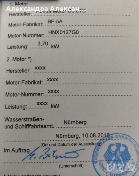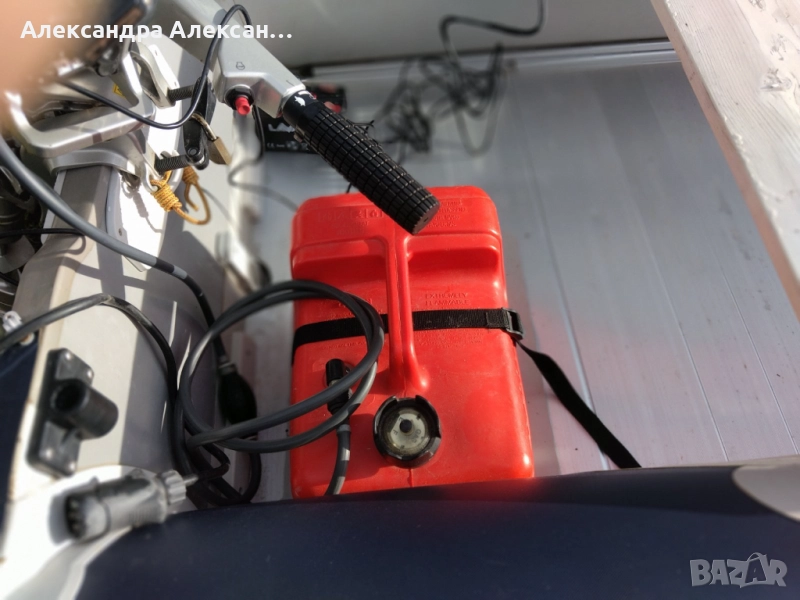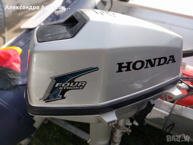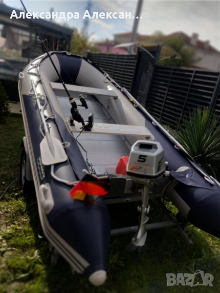 извънбордов двигател с твърдо алуминиево дъно и надуваем кил. и колесар. Лодката е закупена и регистрирана в Германия. Двигателя е четиритактов HONDA 5 к. с. къс ботуш. Има 12 литров оригинален резервоар Honda , с бензиномер. Лодката е пригодена и готова за риболов , разполага с сонар LOWRENS с цветен дисплей и стойки за въдици. Колесара е закупен чисто нов от България и е регистриран. За повече информация се обадете. . . . .Към лодката има и 3 бр. спасителни жилетки.