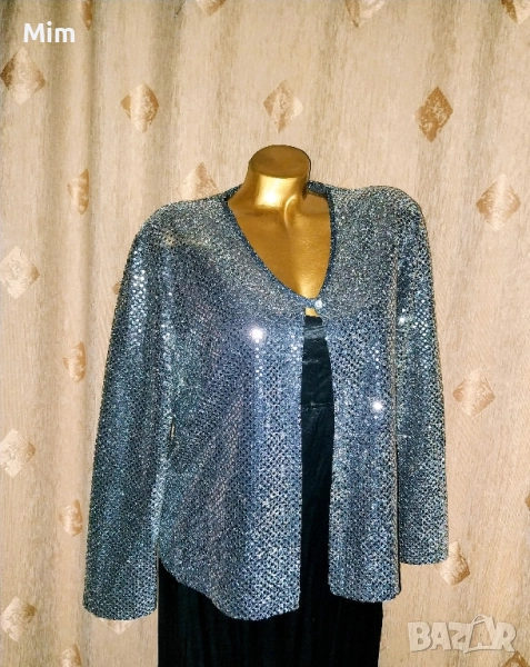Сребрист брокат с бели сребристи пайети, с дълъг ръкав, закопчаването е отпред с копче,Гръдна 120 до 130см еластичност,дължина 60 см,дължина на ръкавите 53 см Неразличимо от ново,