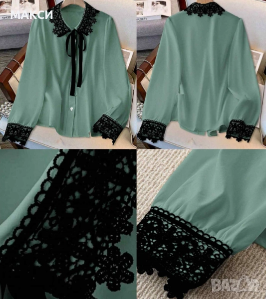 Елегантна макси ефирна риза с красива дантелена черна яка и ръкави в пастелно зелено, снимка 1 - Ризи - 52174371 1/1