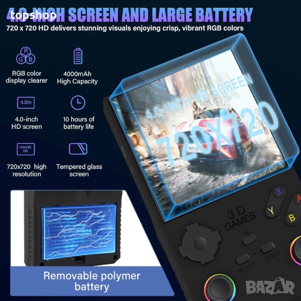 【4" IPS екран и преносимост】- Тази ретро мини игрова конзола с 4-инчов IPS екран с висока резолюция 720*720 прави детайлите на екрана на вашата игрова конзола по-живи, екранът използва подобрено закалено стъкло, осигуряващо здрава защита, гарантираща издръжливост и устойчивост на удар, а конзолата има компактен и лек дизайн, което я прави преносима.
