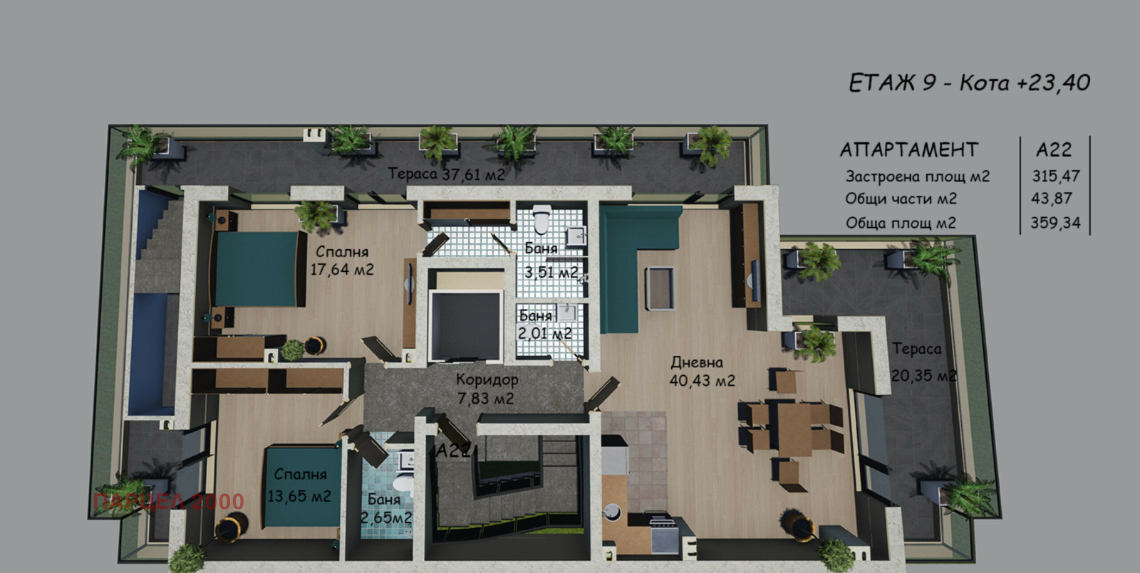 Апартаментът е на две нива -етаж 9 и 10, със застроена чиста площ 315 кв.м. На ет. 9 са разположени коридор,голяма всекидневна с кухненски бокс,голяма тераса, две спални, три бани с WC.На етаж 10 са разположени басейн и закрито помещение, стълбище. Наличен дизайнерски проект за обзавеждане и довършителни работи!