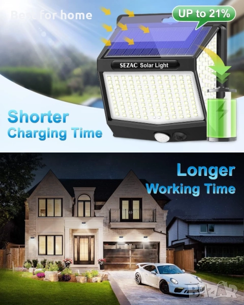 Соларни лампи: SEZAC 218 LED външна соларна лампа, вградена литиево-йонна батерия 2200 mAh, чийто капацитет е по-висок от този на други външни LED соларни лампи. Нашата външна соларна LED лампа може да се зарежда повече от 8-10 часа през нощта и повече от 8-10 часа, когато е напълно заредена през деня (абсорбира достатъчно слънчева светлина). Спестете сметки за ток и я оставете след първата инсталация.