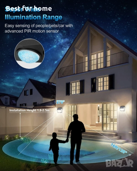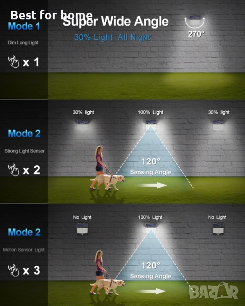 3 интелигентни режима на работа: Тази външна LED слънчева лампа е проектирана с 3 режима на работа: режим на постоянно слабо осветление, режим на сензор за силна светлина и режим на сензор за движение. При монтаж можете да изберете желания режим на работа.
