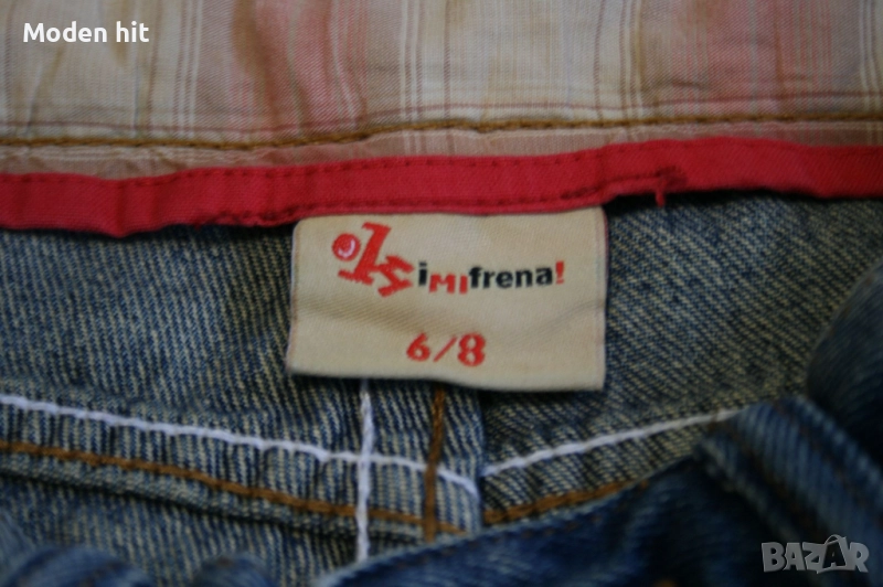 3. Цена 2,50 евро. Дънки Kimifrena. 100% памук. По етикет са размер 6-8 г. Нямат забележки, отлични. Дължина: 78,5/55 см.; талия с ластик и копчета за корекция: максумум 34 см.; ханш: 40 см.