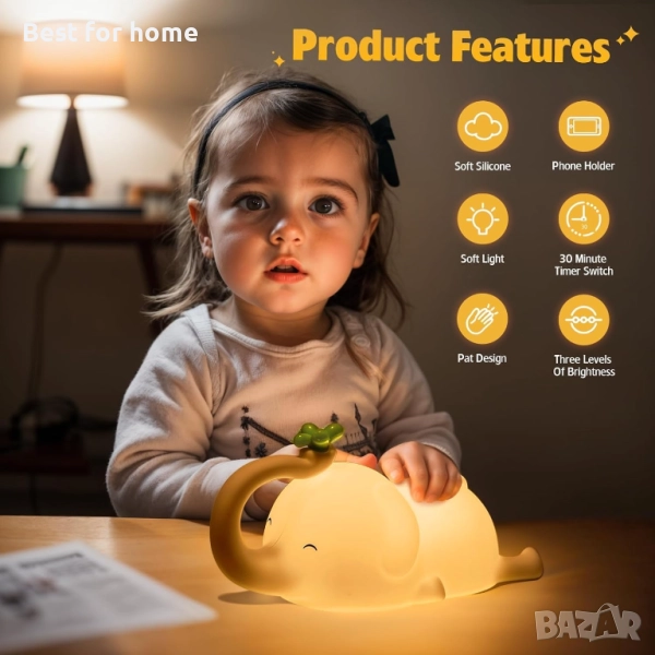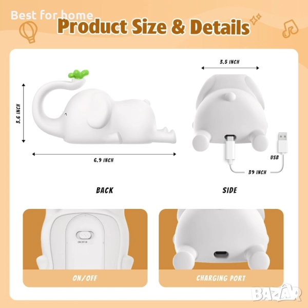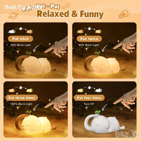 МНОГОФУНКЦИОНАЛНА НОЩНА ЛАМПА С ЖИВОТНИ - 3-степенна регулируема нощна лампа с форма на слон, с функция за сензорно управление. Можете да щракнете в горната част, за да регулирате яркостта на нощната лампа, разделена на слаба, средна, силна три степени и накрая изключена. 30-минутен таймер за изключване, лампата с животни позволява на децата по-лесно да заспят, докато играят. Краката на бебето слон могат да се използват и като държач за мобилен телефон, освен това са лесни за носене и окачване.
