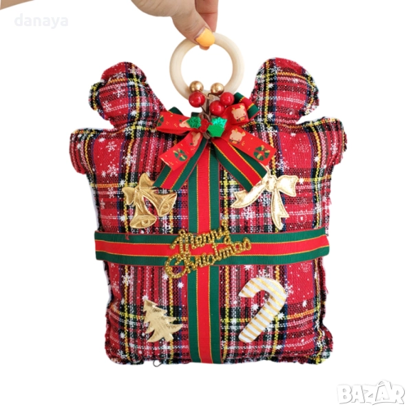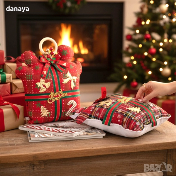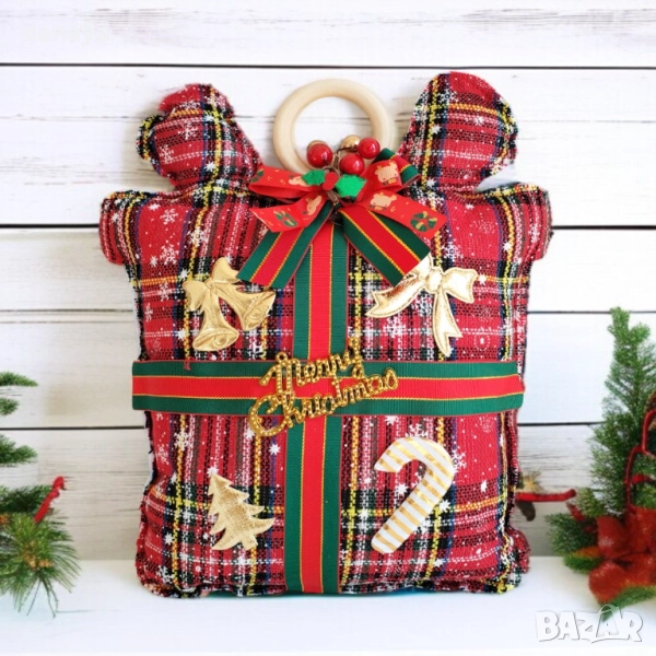 Малка коледна декоративна възглавничка във формата на подарък – идеалното допълнение към празничния интериор. Изработена от мек текстил с пухкав пълнеж, тя съчетава комфорт и стилна визия, като превръща всеки ъгъл в уютен коледен кът. Възглавничката е декорирана с красива панделка, надпис Merry Christmas, златни орнаменти и класически коледен десен в червено и зелено.