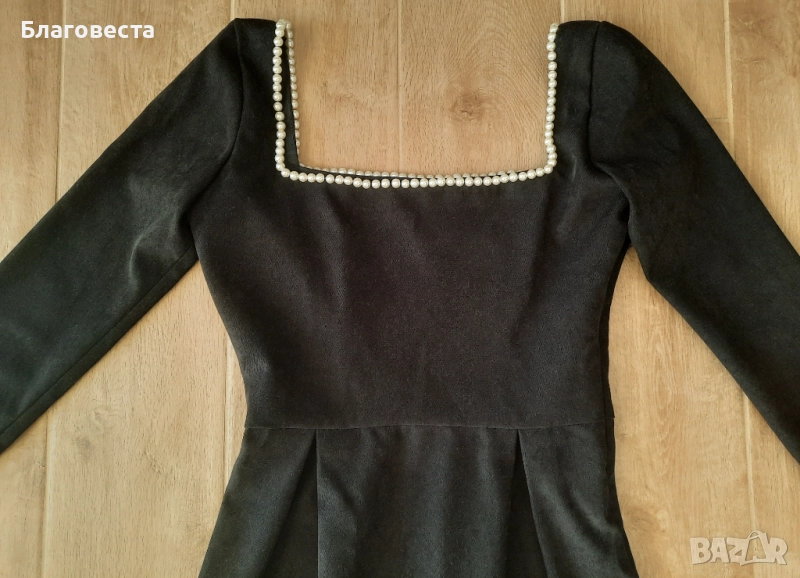 Къса рокля с дълъг ръкав и перли на деколтето.