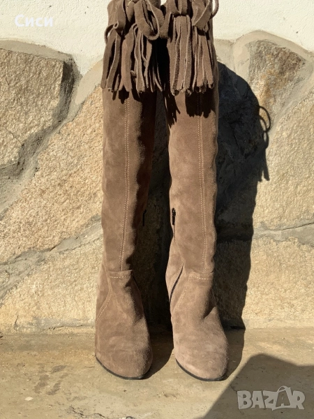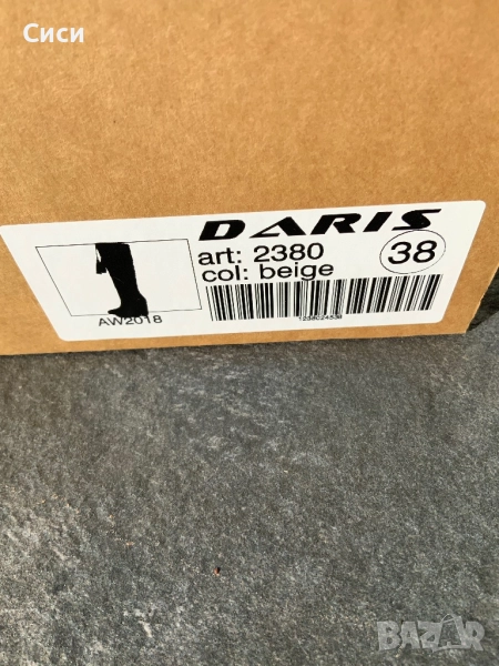 Ботуши DARIS,естествен велур.Обувани веднъж на новогодишно тържество 2-3 часа.С много хубава извивка на ходилото,крака не се изморява от височината.Височина на ботуша от петата е 43см,височина на тока 10см,стоят много елегантно.