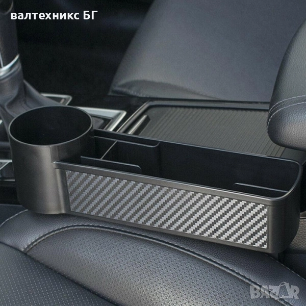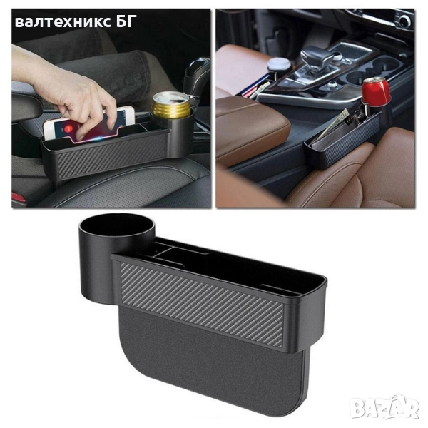Органайзер създаден да пасне между почти всички автомобилни седалки и централни конзоли, този аксесоар ви помага да организирате вещите си в интериора на автомобила. Разполага с отделение за чаша/бутилка и няколко отделения за други предмети – като телефон, слънчеви очила, карти, зарядни кабели и други.