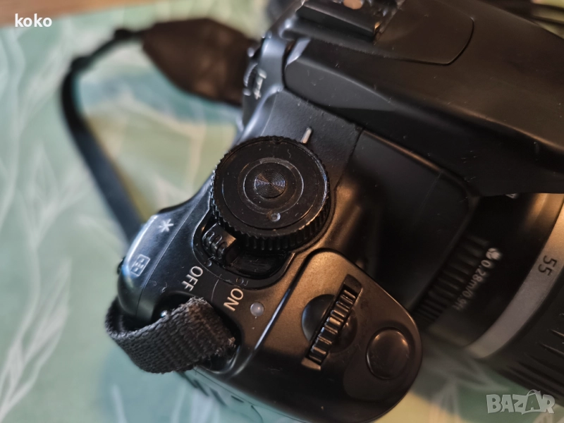 Фотоапарат камера Canon. Работеща има една батерия и зарядно . С мемори карта , чисто нова! Формата на картата е CF (compact flash).Има следи от употреба нормални за времето си , също и липса на гуменото капаче от едната страна на камерата и горе на врътката за смяна на опциите.