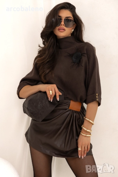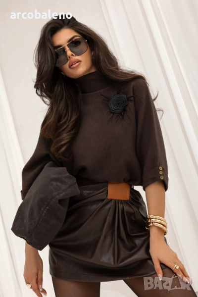 Този пуловер с голяма яка е изработен от мека, удобна плетена материя. Ръкави ¾ с копчета на маншетите и декоративна брошка добавят фин, женствен щрих.