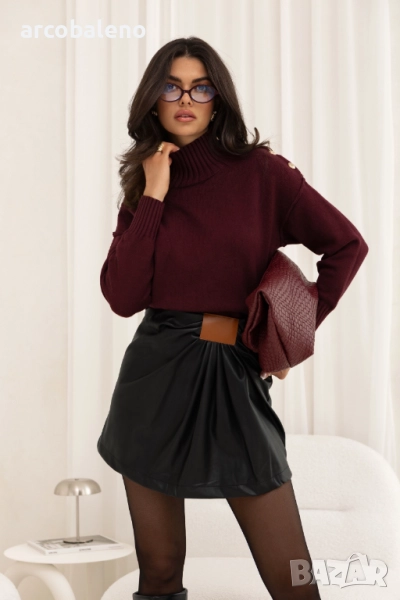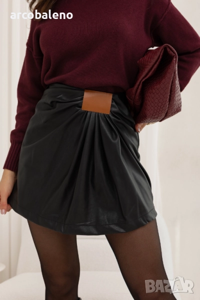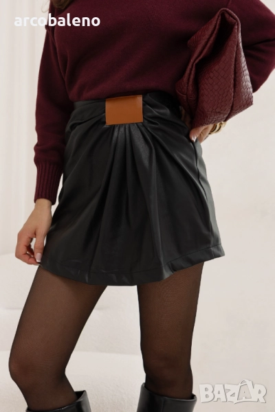 Изразителна, но изключително женствена, тази мини пола е изработена от мека, леко блестяща изкуствена кожа, с впечатляващи плисета и контрастираща талия. Асиметричната ѝ кройка фино подчертава силуета, създавайки модерен, елегантен вид с нотка на смелост.