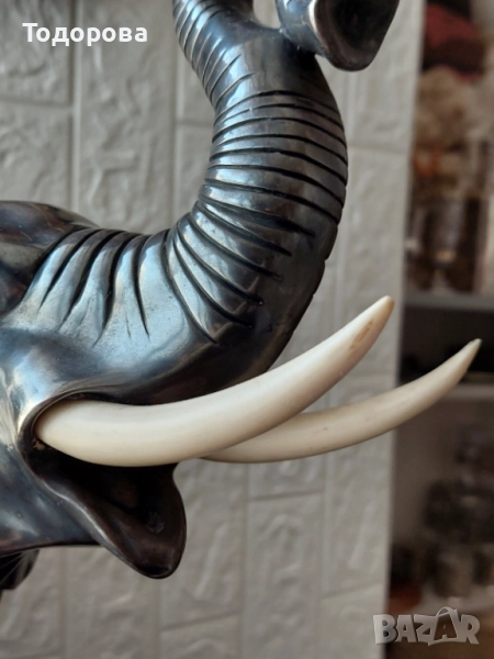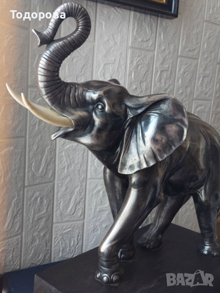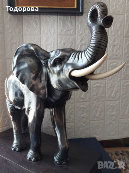 Предлагам за продажба тази огромна рядка сребърна а фигура изобразяваща слон.Цялата фигура тежи 13 килограма.Само среброто е около два килограма.Бивните са от