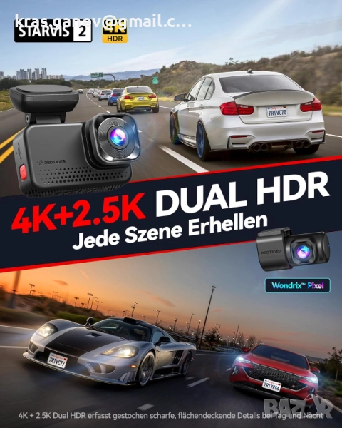 видеорегистраторна камера, проектирана за ясни и надеждни кадри денем и нощем. Оборудвана с усъвършенствания сензор STARVIS 2 IMX678 и чипа Wondrix HDR, тя заснема зашеметяващо 4K предно и 2.5K задно видео за кристално ясни детайли на регистрационния номер и пътя - идеално за пътуване до работа, дълги пътувания или застрахователна защита.