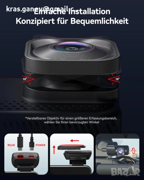Система за бързо монтиране: Регулируемият въртящ се обектив и подвижната скоба правят инсталирането и прехвърлянето между автомобили без усилие.