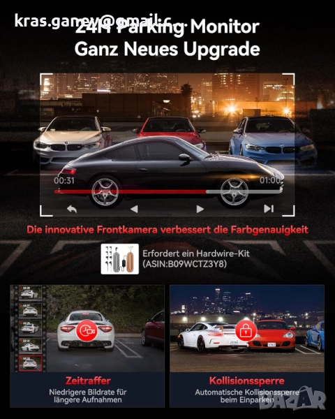24-часово наблюдение на паркирането: Записва, докато сте паркирани. Включва режими за откриване на сблъсък и timelapse за непрекъсната защита денем или нощем.