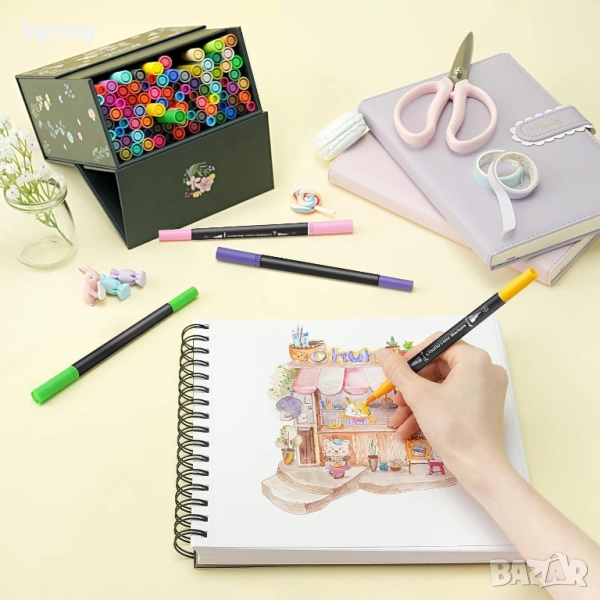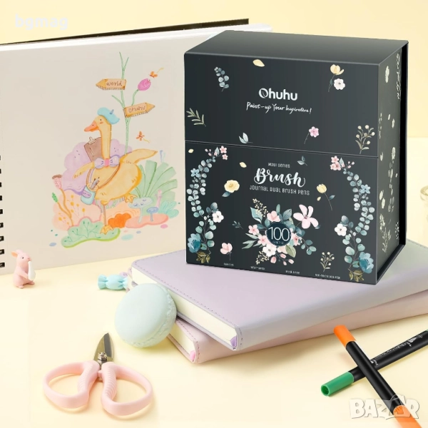 Ohuhu Maui Series маркери с два писеца тип четка и тънък писец, Ohuhu 100 цвята, с мастило на водна основа, смесваеми цветове, четка и тънкописец с фин връх, идеални за рисуване, калиграфия, рисуване на манга, планиране, дневници, изобразително изкуство, надписи с четка и много други творчески дейности свързани с рисуването.