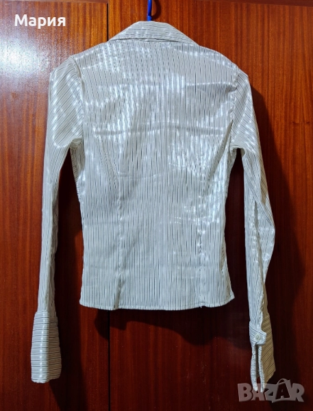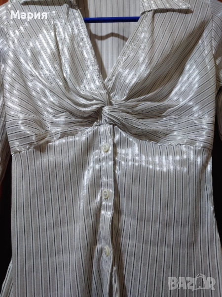 Риза от сатенирана, еластична материя, с райе и декоративен детайл около бюста. Носена за кратко, размер 36/S.