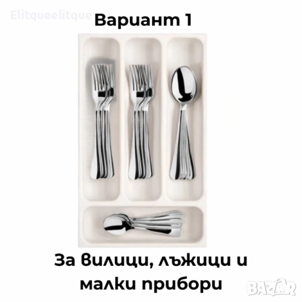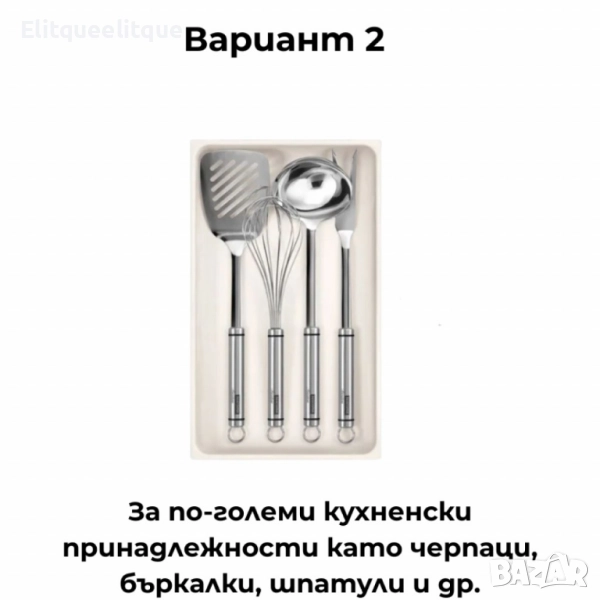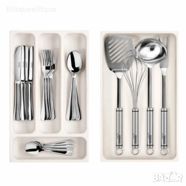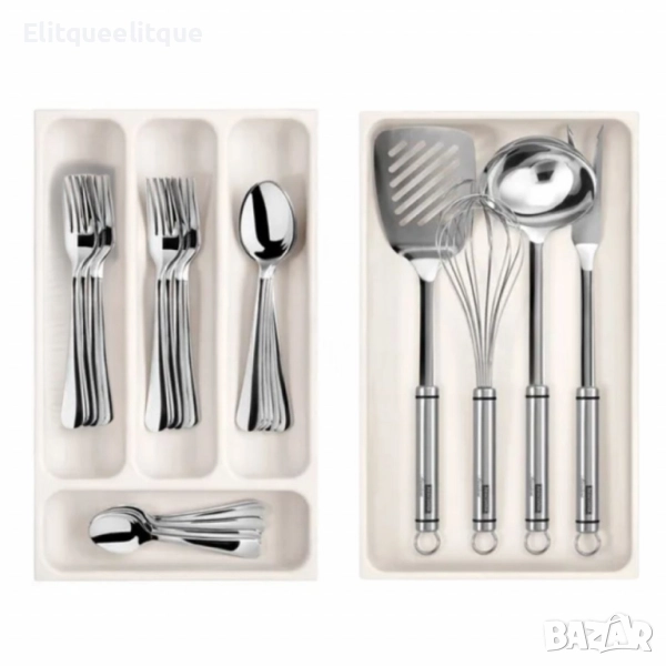 Марка: Tescoma; Серия: FlexiSPACE; Вариант 1: За вилици, лъжици и други малки прибори – четири практични отделения, в които приборите могат да бъдат удобно подредени; Вариант 2: За по-големи кухненски принадлежности като черпаци, бъркалки, шпатули и др; Продукт: