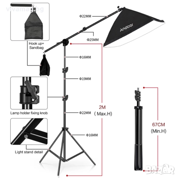 Фотостудийния комплект съдържа софтбокс с рамо жираф