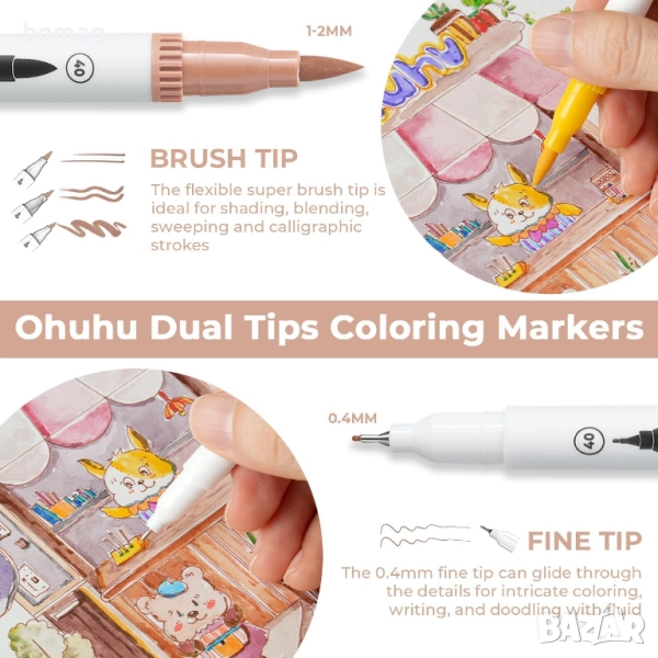 ✎ Четка и фин накрайник, двоен връх, двойна креативност: флумастери Ohuhu с двоен накрайник са задължителни за следващия ви шедьовър! Финият накрайник с диаметър 0,4 мм се плъзга прецизно през фините детайли и е идеален за детайлно оцветяване, писане и скициране. Гъвкавият накрайник с диаметър 1-6 мм е идеален за големи площи, нюанси, градиенти и много други.